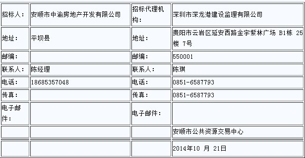 ( 1)报名时提供的委托书须按我中心模板填写(安顺市公共资源交易中心网站下载模板),并提供行贿犯罪档案查询告知函,否则我中心不予受理。(行贿犯罪档案查询相关事宜,请点击我中心网站通知公告栏)( 2)由于本项目情况特殊,前期有相关单位已开展了部分工作,投标单位中标后需与前期相关单位做好交接工作,并承担全额费用,项目前期情况请咨询招标人或招标代理机构。( 3)为确保工程质量、进度、造价控制,招标人将对投标人配备的监理项目组人员实行考勤制度,总监理工程师须按国家相关规定在施工现场履行监理工作职责 ,因中标人监理项目组人员不到位给招标人造成损失的,由中标人负责赔偿。( 4)投标保证金截止时间为 2014年 10月 21日下午 16:00时。