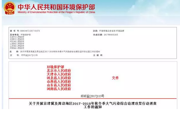 环境保护部会同北京、天津、河北、山西、山东和河南省(市)人民政府,制定《京津冀及周边地区2017-2018年秋冬季大气污染综合治理攻坚行动巡查方案》(以下简称《巡查方案》)。现印发给你们,并就有关事项通知如下: