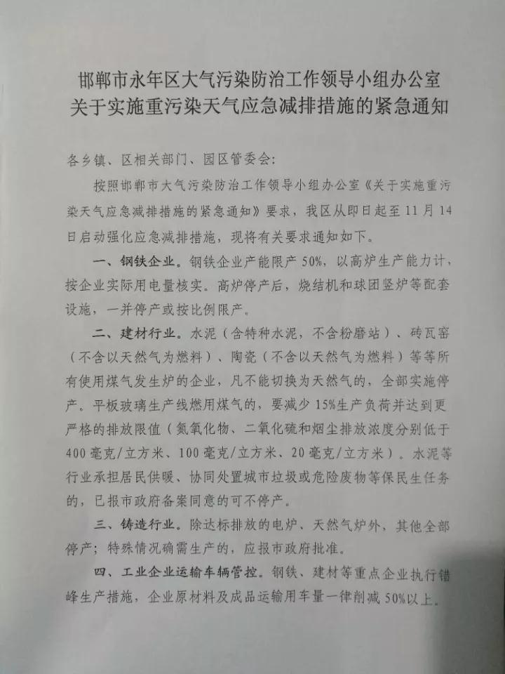 按照邯郸市大气污染防治工作领导小组办公室《关于实施重污染天气应急减排措施的紧急通知》要求,我区从即日起至11月14日启动强化应急减排措施。按照通知,我区将从钢铁企业、建筑行业、铸造行业、工业企业运输车、秸秆焚烧、工地扬尘等六个方面进行严格管控,详细情况如下: